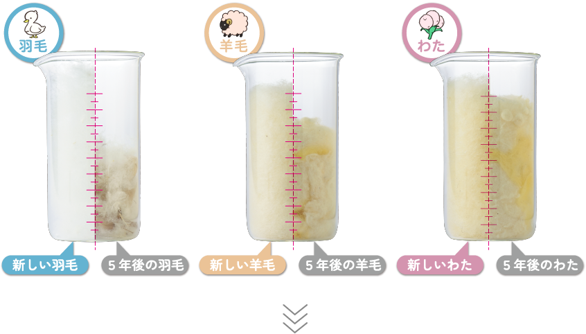 ※使用期間平均5年、ダウン率50%以上の羽毛ふとんを使用した際の保温力変化:当社調べ