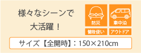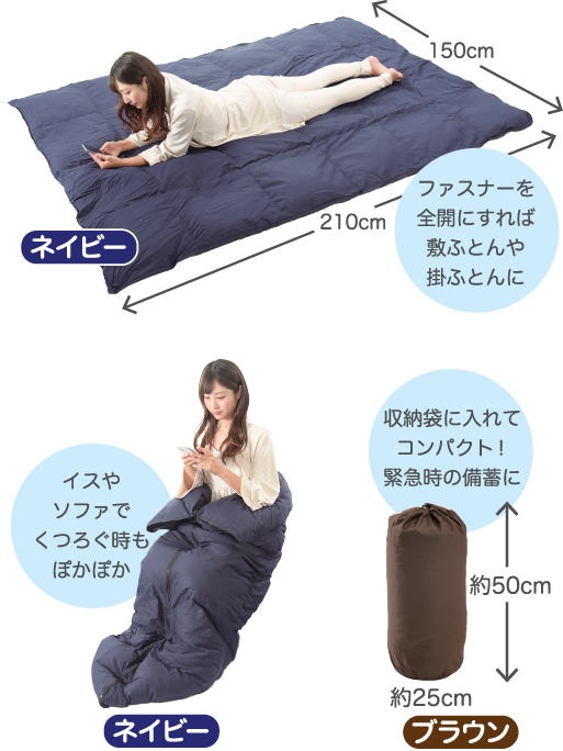 | 仕上がりサイズ | 全開(肌掛)時:150×210(cm) シュラフ:75×210(cm) 収納(専用ケース)時:約50×直径25(cm) |